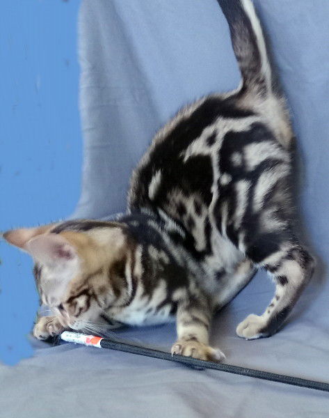 On April 13, 2021, Rosaelia and Anton produced a singleton SBT F6 brown (black) marble male kitten. MC# 99000005995149. His name is Marvin. This boy was showered with lots of attention from the moment of his birth by both his feline Mom and his human Mom. As a result, he is super human oriented and craves attention. He loves to play and is always doing "happy paws". If you are looking for a nice pet, at a reasonable price, this boy may be the one for you. Marvin has veen vaccinated, microchipped and neutered. Because he is off standard with respect to his pattern, he is being offered at $900 as a PET only. If you are interested in this boy, please contact blackmagicarabiians@hughes.net and reference his microchip number (MC#).