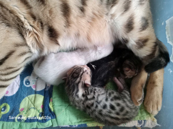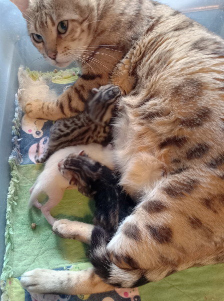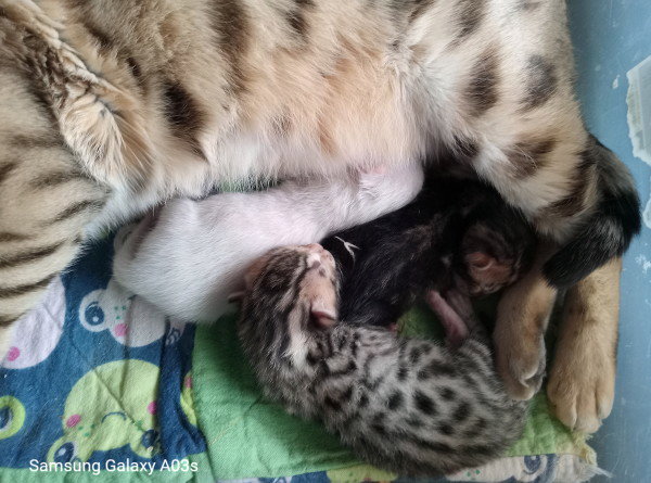 Rambler and Weston produced a beautiful litter of three males on July 28, 2021. These boys are now ready to go to their forever homes. They have been vaccinated and microchipped. These are F6 TICA registered kittens. All of Rambler's prior male kittens have matured at 17 lbs or more. Hence, if you are looking for a good deal on a kitten that may mature to be larger than the usual later generation kitten, these boys may be just right for you.